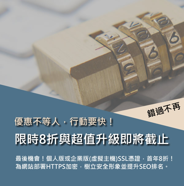 升級SSL憑證優惠倒數中,個人版、企業版首年享8折!